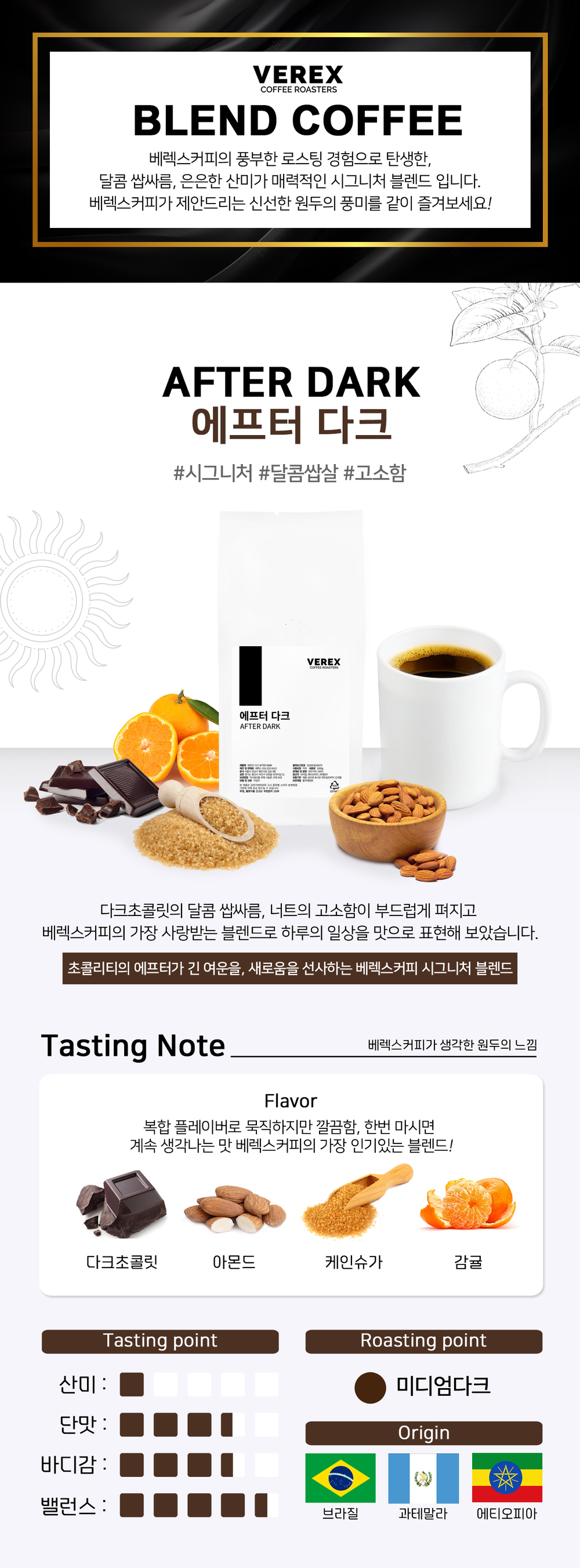 부드러운 초콜릿과 같은 달콤 쌉사름한 맛 속에 은은히 느껴지는 감귤의 산미가 훌륭한 블렌딩