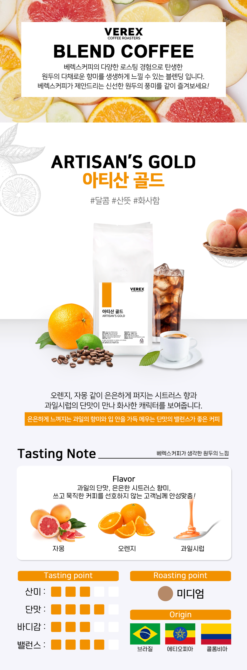 오렌지, 자몽 등 시트러스의 산미와 과일시럽 같은 단맛이 화사하게 느껴지는 가볍고 산뜻한 블렌딩