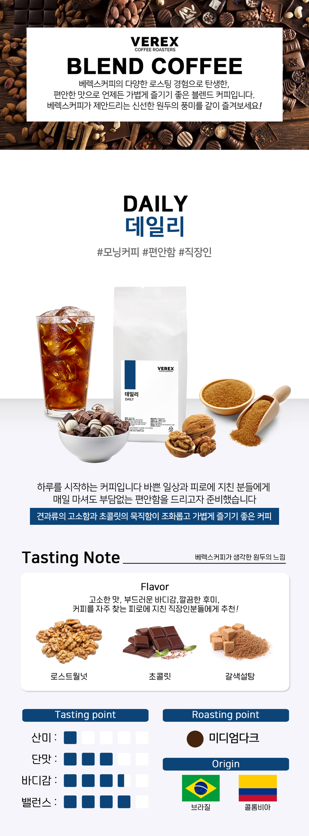 견과류의 고소함과 다크 초콜릿의 묵직한 맛이 조화를 이뤄 매일 즐기기 좋은 커피 블렌드